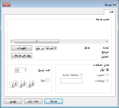 للاستفادة من ميزات الطابعة التي يوفرها برنامج تشغيل الطابعة، انقر فوق أو في الإطار بالتطبيق لتغيير إعداد الطباعة. قد يختلف اسم الجهاز الذي يظهر في إطار خصائص الطابعة، وذلك تبعًا للجهاز المستخدم.