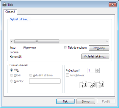 Základní nastavení tisku, včetně počtu kopií a rozsahu tisku, zvolte v okně .
