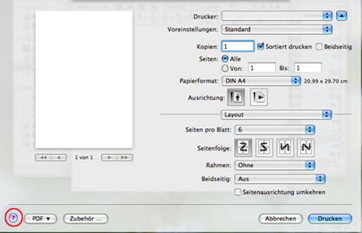 Klicken Sie in der linken unteren Ecke des Fensters auf das Fragezeichen und klicken Sie dann auf ein beliebiges Thema, über das Sie nähere Informationen erhalten möchten. Daraufhin wird ein Pop-up-Fenster mit Informationen über diese Option angezeigt, die der Treiber zur Verfügung stellt.