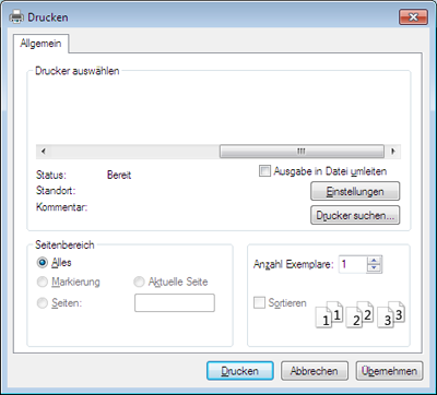 Die allgemeinen Druckeinstellungen einschließlich der Anzahl der Exemplare und des Seitenbereichs werden im Fenster festgelegt.