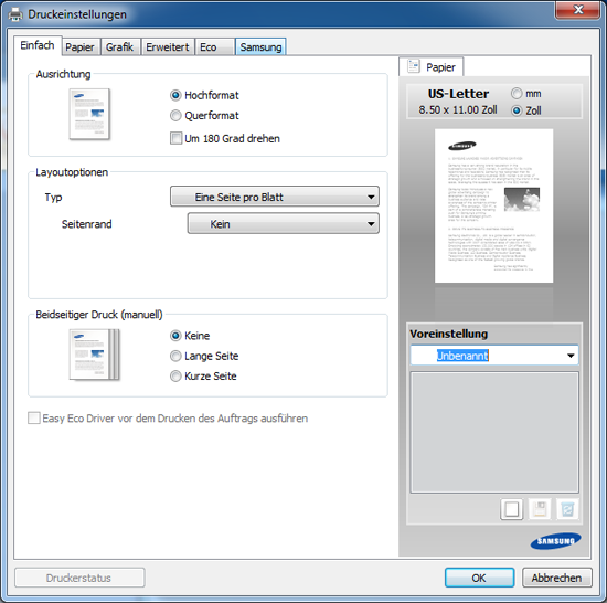 Sie können den aktuellen Druckerstatus einsehen, indem Sie auf die Schaltfläche klicken (siehe Samsung-Druckerstatus verwenden). |