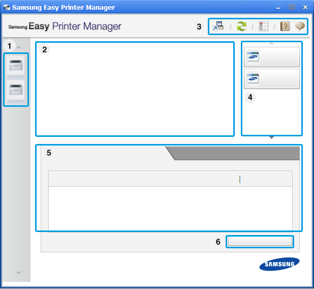 Samsung Easy Printer Manager arabirimi, aşağıdaki tabloda açıklandığı şekilde çeşitli temel bölümlerden oluşur: